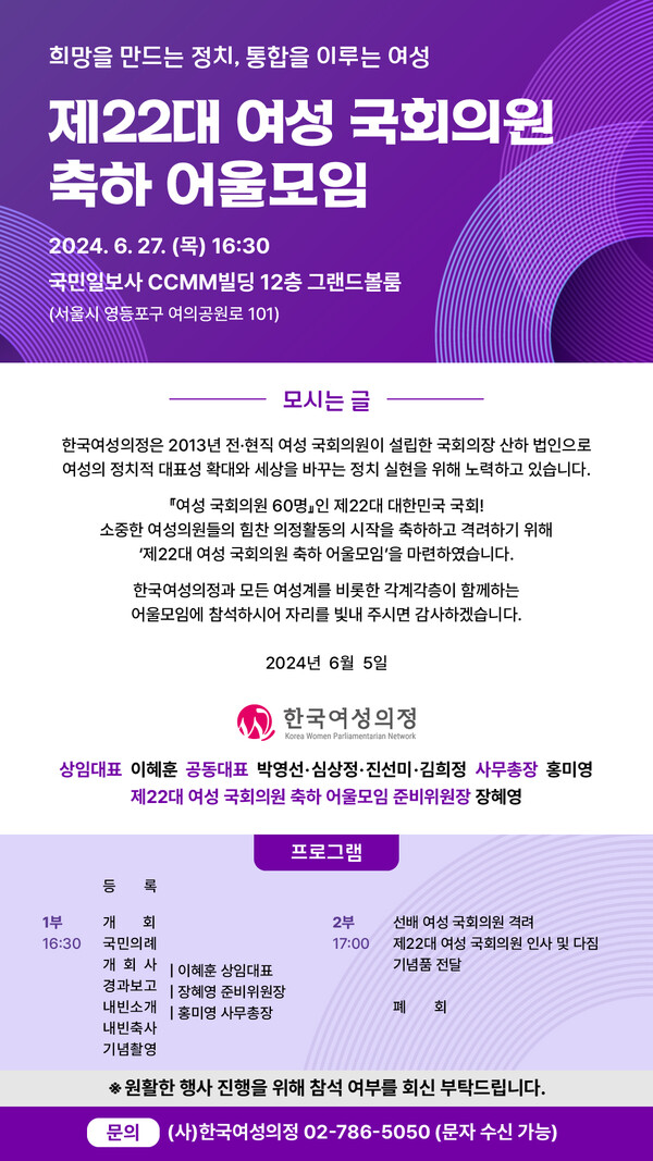한국여성의정은 27일 ‘제22대 여성 국회의원 축하 어울모임’을 개최한다.