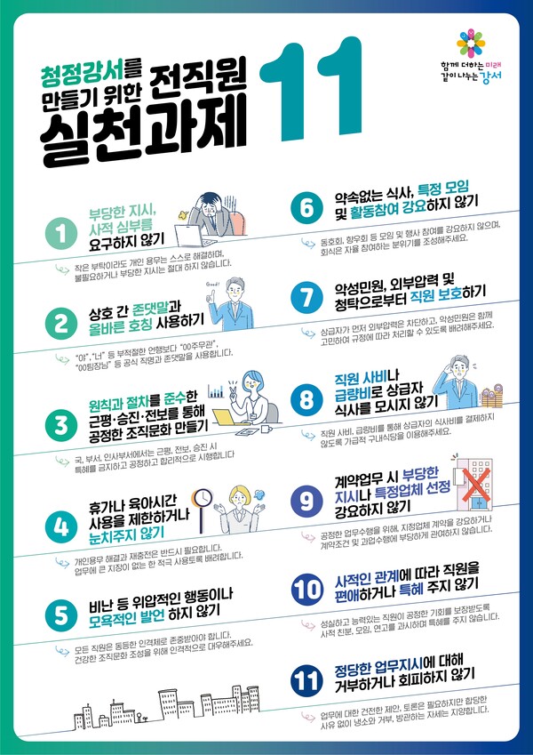 이번 실천과제는 20~30대 MZ세대 공무원으로 구성된 모임인 ‘강서구 혁신주니어보드’의 설문 조사를 통해 선정됐다. 갑질과 내부청렴도 저해 사항을 유형별로 정리해 120건의 의견 중 상위 11가지 과제를 선정했다.