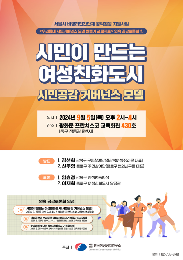<우리 동네 시민거버넌스 모델 만들기> 프로젝트는 2024년 서울시 비영리민간단체 공익활동지원사업으로, (사)한국여성정치연구소가 3회 연속토론회와 심포지엄을 개최한다.