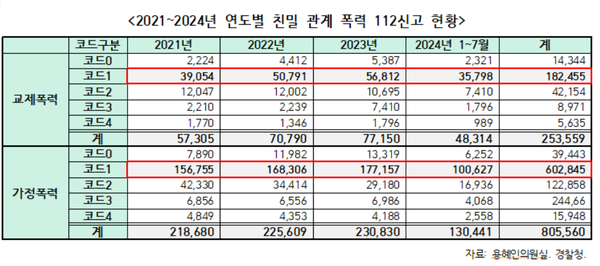 2021~2024년 7월까지 교제폭력 신고건수 25만3559건 중 코드1 지정건은 18만2455건(72%)으로 집계됐다. 동기간 가정폭력 신고 건수 80만5560건 중 코드1 지정건도 62만845건(74.8%)에 달했다.