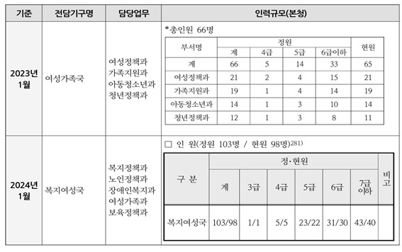 경남여성단체들의 끊임없는 요구로 여성가족국이 국 단위로 행정개편이 이뤄진 것은 민선 7기인 2019년이다. 민선 7기 두 번째 조직 개편을 통해 종전의 여성가족정책관 및 저출생‧고령사회정책관 등을 묶어 ‘여성가족청년국’으로 격상됐다가 이후 여성가족국으로 개편됐다. 그런데 민선 8기에서 5년 만에 여성가족국은 축소‧개편돼 복지여성국이 됐고, 2026년 1월 1일까지 존속기한을 정한 한시적 기구로 설치됐다. (2024. 1. 2. 개정‧시행된 경상남도조례 제5562호, 「경상남도 행정기구 설치 조례」 부칙 제3조, 현재 이 조항은 2024. 7. 4. 개정으로 삭제됐음.)