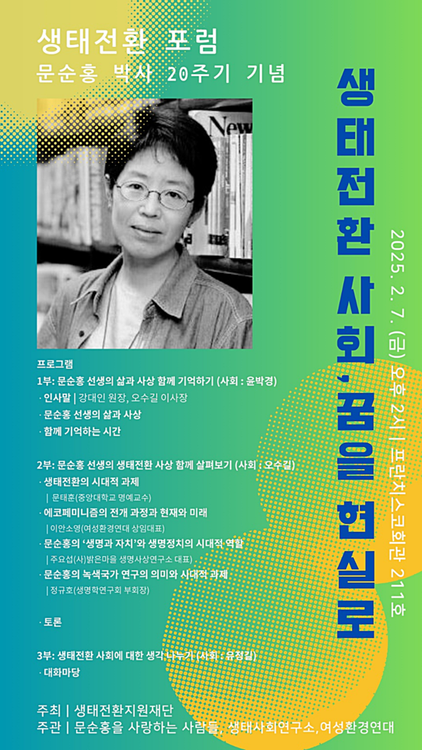이번 포럼은 생태전환지원재단이 주최하고, ‘문순홍을 사랑하는 사람들’, 생태사회연구소, 여성환경연대가 공동 주관한다.