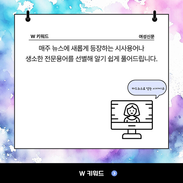 [W 키워드 카드뉴스] 자신을 위한 소비 ‘미코노미(Meconomy)’ [W이슈 키워드 카드뉴스] WHO가 경고한 ‘의자병’, 여성 건강에도 위협 [W이슈 키워드 카드뉴스] 명품 소비 트렌드와 맞물린 ‘웨딩플레이션’ [W이슈 키워드 카드뉴스] 건강 중시하는 ‘헬스 디깅’ 유행 [W이슈 키워드 카드뉴스] ‘이제는 명품말고 대체품 소비’ 듀플리케이션 [W키워드 카드 뉴스] 여성 혐오 살해 ‘페미사이드’